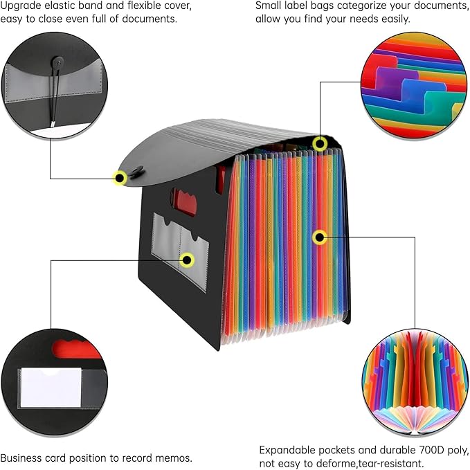 - 【Beauty Appearance】The white cover and rainbow pockets for this new potable filing holder with flexible lid is designed by ourselves. It is the newest version in the market now. It not only collecting your documents in order and find them easily because of the tags, but also decorates your office or home desk charming and out of standing.