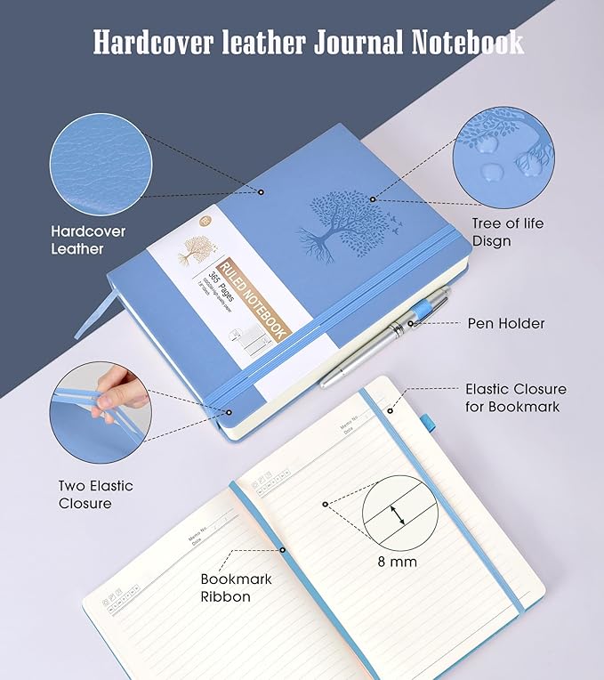 - 【180°Lay Flat Journal Notebook】The 180° lay flat design makes writing easier, reading more convenient, and taking notes more efficient.At the same time, the hardcover notebook is designed with1 elastic closure band & 1 elastic bookmark band. to make it tightly closed to protect your content, and the inner paper will not be curled and kept flat.