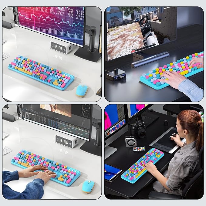 - 【 Wireless Keyboard Mouse Combo】The inspiration for these cute rounded keys comes from vintage typewriters offering you visual enjoyment and a retro feeling to type. With colorful key caps, make you be distinctive in the office and work full of fun.