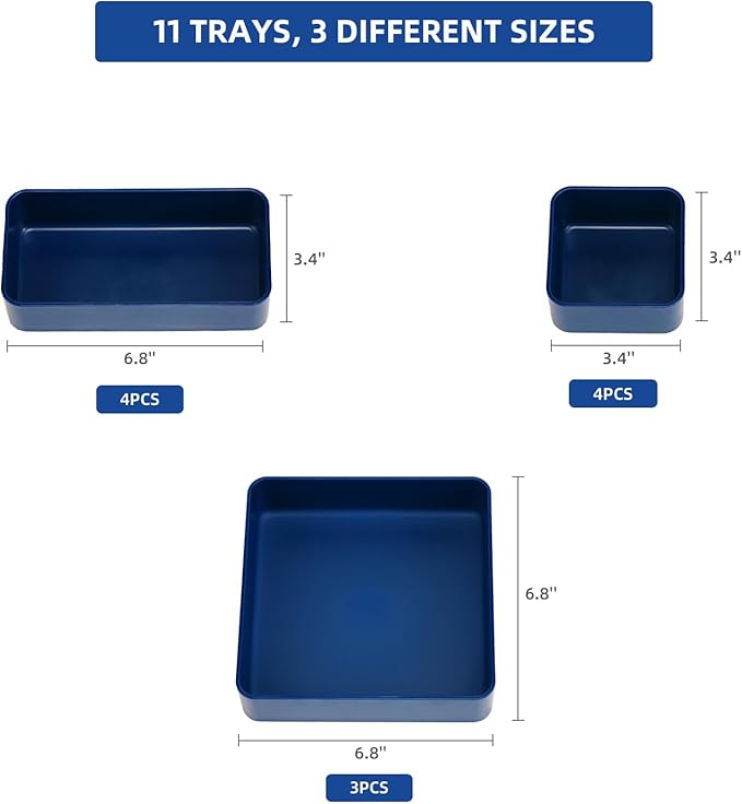 - INCLUDES: 11 stackable trays each measuring 2 inches deep. Tray measures 6.8 x 6.8 inches (3 pack), 3.4 x 6.8 inches (4 pack), 3.4 x 3.4 inches (4 pack).