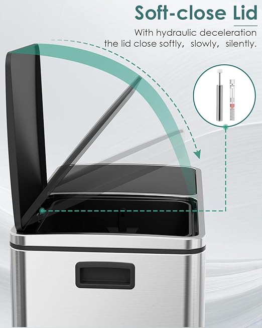 - GENTLE&SEALED LIDS: 60L trash lid is designed with ABS hydraulic deceleration to close gently and silently, minimizing noise and preventing it from slamming shut. Sealed lids fit tightly to block unpleasant odors, keeps your home smelling fresh and clean.