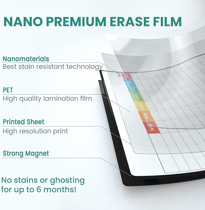 - Erases easily - We use nano premium erase film on our products. Compared to the old PET film, the nano material will make your writings super easy to be wiped off even after you leave the writings on the calendar for a long time.