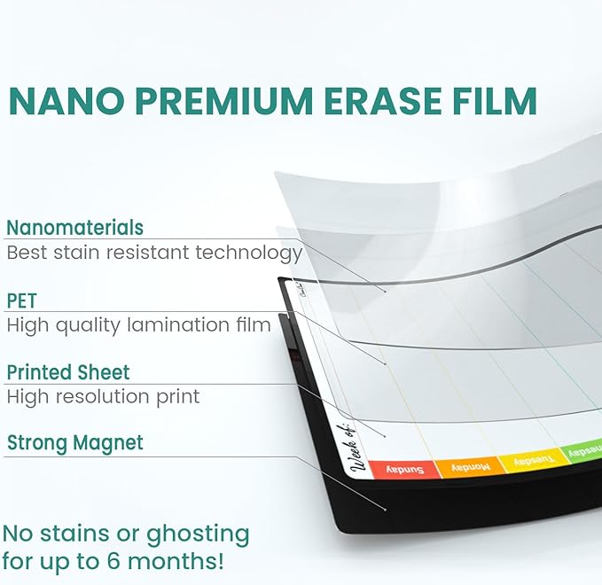 - Erases easily - We use nano premium erase film on our products. Compared to the old PET film, the nano material will make your writings super easy to be wiped off even after you leave the writings on the calendar for a long time.