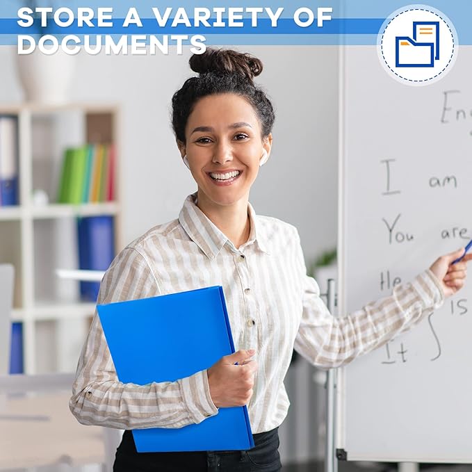 - Practical and Useful: with a blue plastic folder, you can put your catalog, tables, reports, presentations and more for display; Each one has 2 internal pockets to help organize and store your letter sized paper and documents; There are also 3 prongs to secure your 3-hole loose leaf paper in case it falls, and the card slot can hold your ID card or business card, practical for your daily work