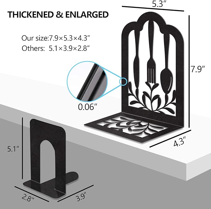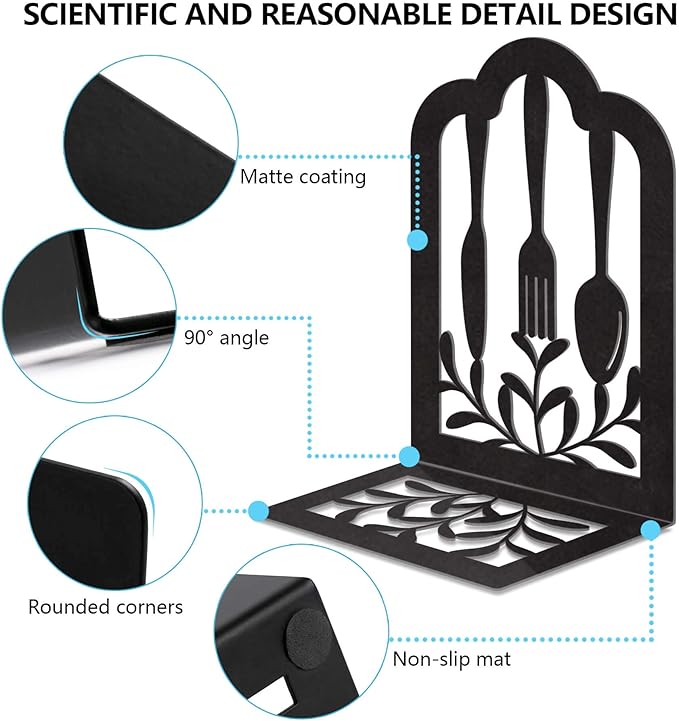 Book Ends,Metal Bookend,Bookend Decorative Heavy Book Ends for Shelves, Home Decorative Bookends for Heavy Books,Non-Skid Black Book Holder for Kitchen Housewarming Cooking Lover Gifts