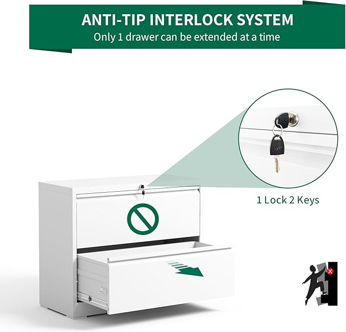 - 【Locking Cabinet for Security】This 2 drawer file cabinet with lock has an anti-tip design, which ensures that only one drawer can be opened at a time, preventing tipping and protecting your safety. The upgraded interlock system with 1 lock and 2 keys keeps your important documents safe.