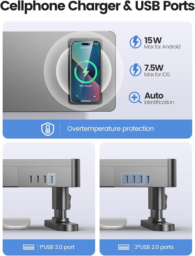 - 【Convenient Phone Charger & USB Ports】The built-in auto charger offers handy and instant charging for your Oi-enabled electronic devices such as iPhone, cellphones, Air Pods etc. Simply place your smartphone on the charging pad and let the magic happen. The monitor stand with charger supports a maximum output of 15W for Android and 7.5W for iOS devices. Stay connected effortlessly with multiple USB ports, you can easily connect peripherals like keyboard, mouse, U disk, hard drives, etc.