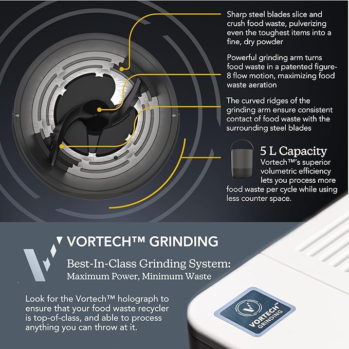 - INNOVATIVE VORTECH SYSTEM: The Eco 5’s Vortech(TM) patented grinding system can grind what others can't. Toss in your pits, peels, bones, leftovers! Vortech's efficiency means the FoodCycler indoor electric composter alternative consumes less power than your average clothes dryer.