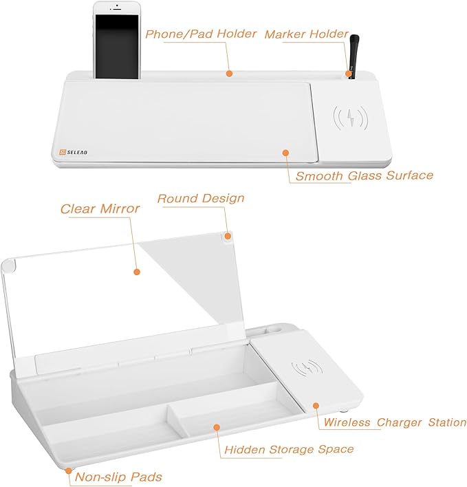 - 📳MULTIFUNCTIONAL: Storage+Wireless Charging+Write+Hold+Keyboard Stand+Built-in Mirror, our desktop white board is an all in one multipurpose board. Equipped with black dry erase markers, eraser and 3ft USB Type C cable.