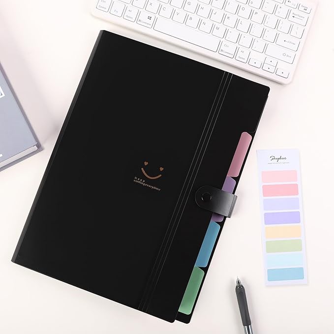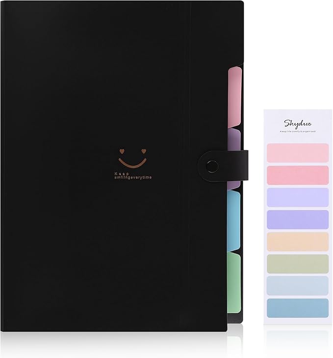 - Skydue file organizer with 5 pockets , 4 tab positions and 8 colored label stickers provide easy organization for multiple classes or projects.