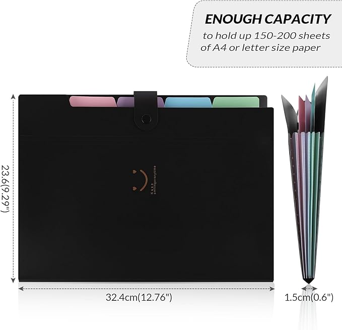 SKYDUE Expanding File Folder with 5 Pockets, Cute Accordion File Organizer, Letter Size Filing Folder, Portable Paper Organizer, School Office Supplies Black