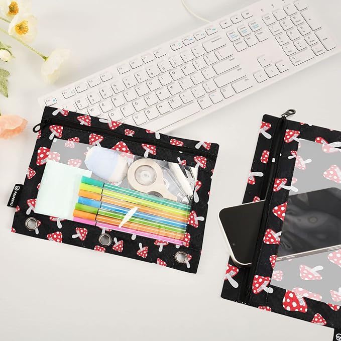 ALAZA Pencil Pouch for 3 Ring Binder, Cartoon Forest Red Mushrooms Binder Pencil Pouches with Clear Window Zipper Pencil Case Cosmetic Bags for Office College Supplies, 2PCS