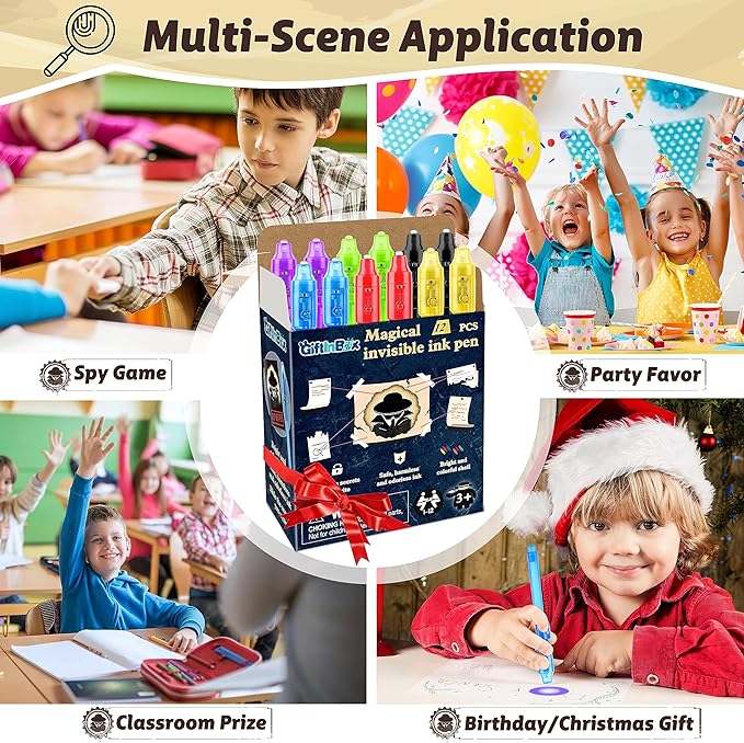 - Awesome Kids Party Favors - These glow in the dark party supplies are an ideal and unique kids party favors for kids 8-12. Suitable for any occasions like birthday parties, classroom prizes, or goodie bag stuffers. Perfect spy kit for games like the escape room, spy games, riddles, skin tattoos, etc. Whether you’re looking for a game for your kids or organizing a spy party, this invisible ink pen set will provide hours of entertainment.