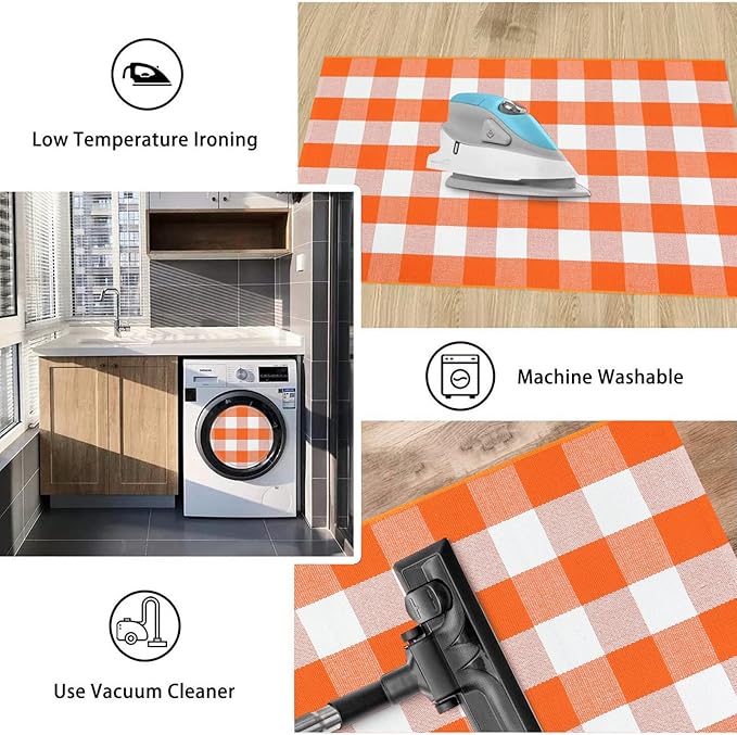 - Non-Fading Cotton Materials: Orange and white buffalo check rug made of cotton materials,soft and comfortable to the touch,the eco-friendly fabric is great at water absorption, antistatic.Due to yarns that are dyed into specific colors before being woven into a design,not printed,needn't worry faded,making it more suitable for outdoor use