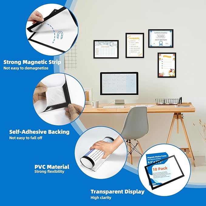- 【MULTI-PURPOSE ADHESIVE FRAME】The magnetic document holder is suitable for store, supermarket, home, office, school, restaurant, factory, hotel to display poster, certificate, notice, schedule, price list, photo, memo, etc. Delivery includes 10 pack magnetic frames for wall.