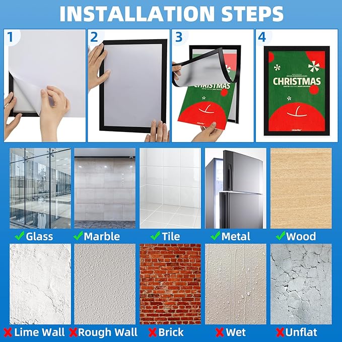 - 【MAGNET & STICKER BACK】The backside of magnet frame is both self-adhesive (smooth surfaces) and magnetic (magnetic surfaces). The super adhesive force makes the wall sign holder not easy to fall off. The magnet frames can be repositioned and reused.