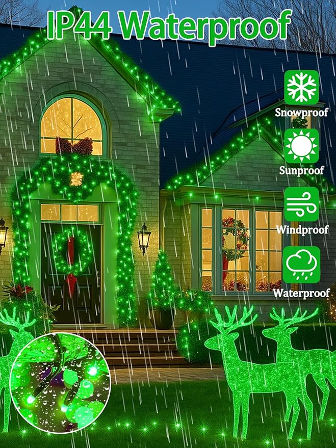 - IP44 Waterproof String Lights Outdoor: These Xmas string lights are designed with IP44 waterproof. The green lights can be safely used outdoors in rainy and snowy weather without affecting the brightness or causing short circuits (please keep the plug dry). The fairy lights plug in can be easily installed wherever needed. Simply plug in and watch ordinary corners become extraordinary