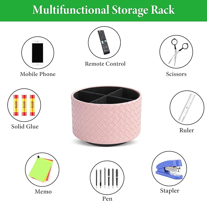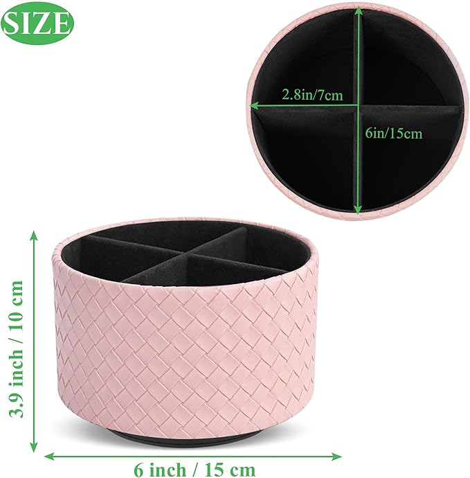 Hennaja Round Leather Art Supply Organizer,Remote Control Holder,360 Degree Spinning,Multi-Functional Pencil Holder,4 Compartments Desktop Stationary Organizer(1-Weave Pink)