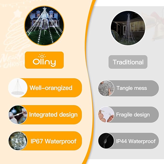 Ollny Christmas Lights Tree 340LED with Topper Star, IP67 Waterproof Remote Control Waterfall Lights with Pole, 16 Modes 3 Timers Dimmable Light Decorations for Outdoor Yard Garden Lawn(Cool White)
