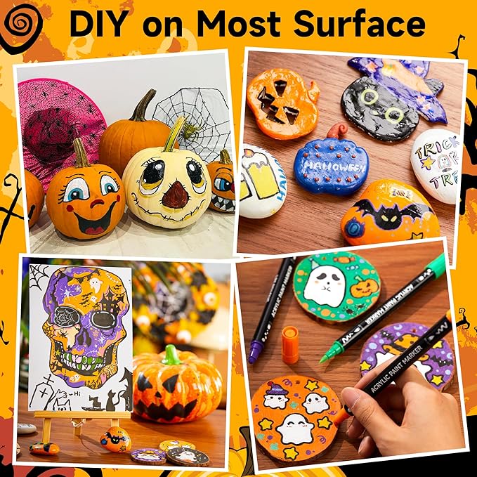 - 【MULTI-PURPOSE】: Enjoy creating art projects on a variety of surfaces, acrylic paint marker set suitable for rock painting, ceramic and mug painting, glass and wine glass painting, wood, fabric, stone, metal, plastic, canvas, Christmas ornament, Halloween pumpkin painting, calligraphy, scrapbook, bullet journal, brush lettering, custom mugs, DIY crafts projects, and much more for both smooth and porous surfaces.