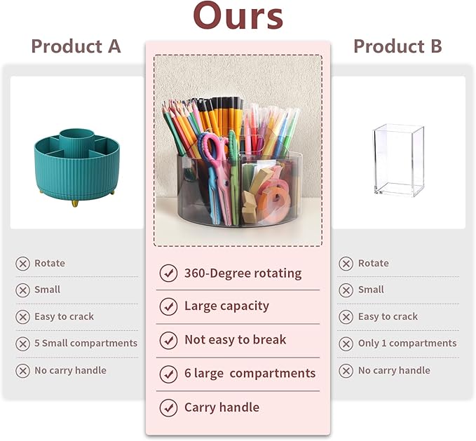 - 360 Degree Rotating Desktop Organizer -This organizer with 360 degree rotating designed, can not only organize pens and pencils, but also makeup brushes and lipsticks.This acrylic desk organizer making your tabletop look more advanced. Our pen organizers can be spins both sides, which is very convenient for storing pens and craft supplies, and it is easy to find and take the items we need by gently rotating it.