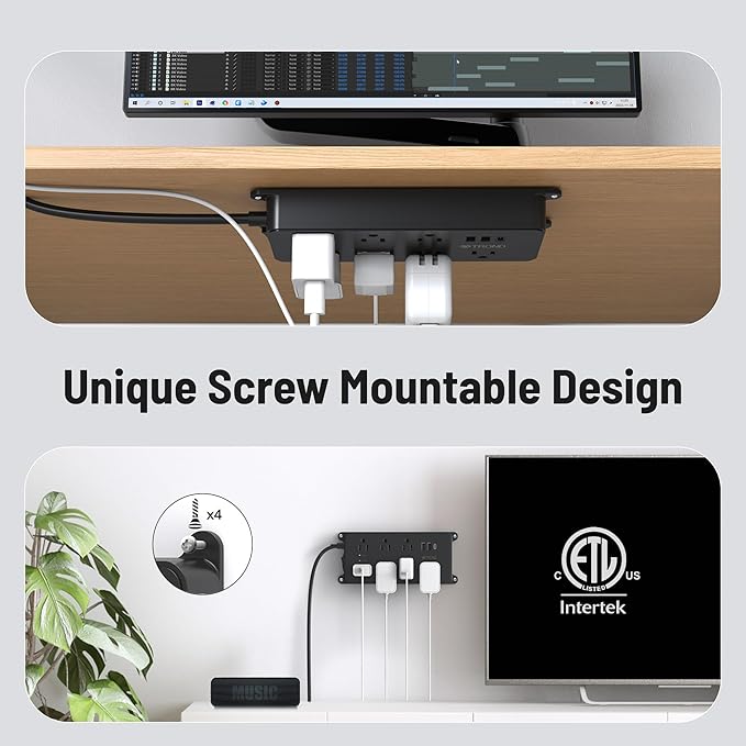 - Power Strip Wall Mount: Four screw-mounting tabs allows you to securely install this wall mountable power strip in various applications, including entertainment center, dorm room, guest room, garage, desktop, under counters, workbenches, wallmounts, floormounts, etc