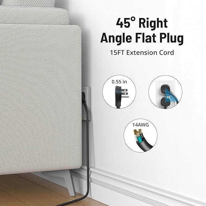- 15ft Extension Cord Flat Plug: This surge protector is made of 14 AWG pure copper for extra durability, the 15ft extension cord is heavy duty and has better current carrying capacity (15a). The low profile right angle flat plug eliminates awkward cords from cluttering and doesn’t block the bottom receptacle