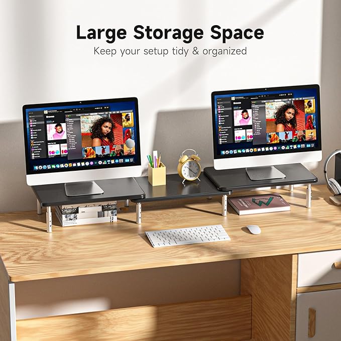 - Ergonomic Double Monitor Riser: Raise your monitor by 5.9", helping you to keep a good sitting posture and prevent the possible stress on neck, back and shoulder during your long time of work.