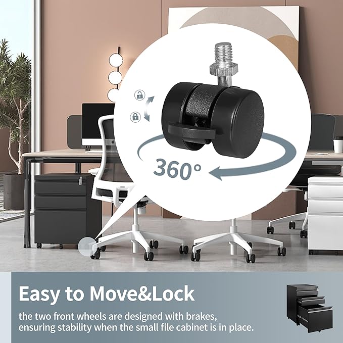 - Convenient Mobility: The file cabinets for home office is equipped with four wheels, allowing easy mobility within your office space. With the added convenience of wheels, you can effortlessly move the file cabinet with lock to different locations as needed. Additionally, the two front wheels feature brakes, ensuring stability when required. Once you have positioned the locking file cabinet, you can secure it in place to prevent any unwanted movement or potential accidents.