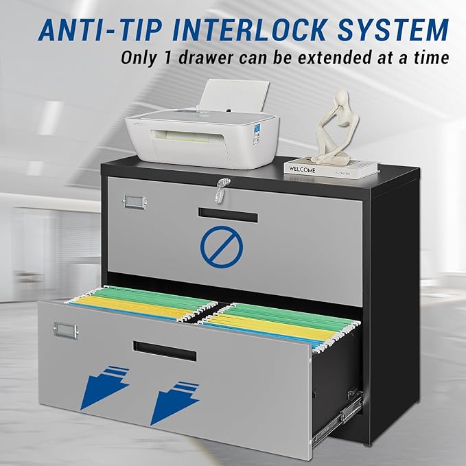 - ANTI-TILT DESIGN- When you fully open one drawer of this file cabinet, the other drawer cannot be opened. This is to prevent the drawer from storing too much paper and causing the cabinet to topple over.