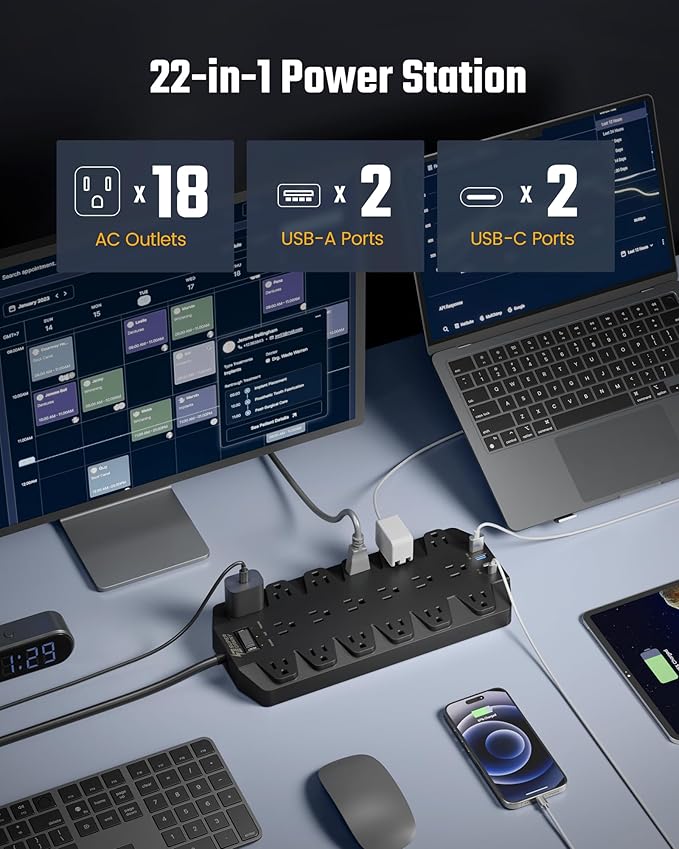 - 【22-in-1 Versatile Power Strip】SUPERDANNY heavy duty power strip equipped with 18 AC outlets, 2 USB-A ports, and 2 USB-C ports to gaming room or streaming, office desk, TV, phone, tablet, PC, laptop, and other devices simultaneously.