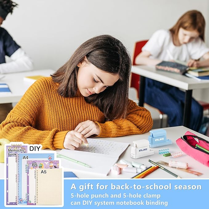 Mini 5-Hole Binding Machine - IMLIKE 5 Holes Binding Machine with 16 Loose-Leaf Binding Strips - Easy to Add or Remove Papers, 4 Sheets Capacity (A4/30 Holes, B5/26 Holes, A5/20 Holes) - Blue