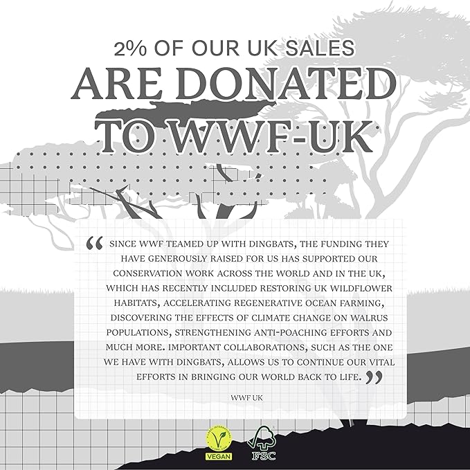 - SUSTAINABLY SOURCED, ENVIRONMENTALLY CONSCIOUS: Join us in our commitment to sustainability. Crafted from recyclable materials and FSC certified paper, our notebooks are a sustainable option and proudly Vegan Certified. Additionally, for its UK sales, Dingbats* Notebooks Ltd donates 2% of its revenue to WWF-UK, a charity registered in England and Wales (1081247).