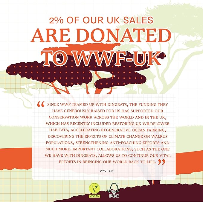 - SUSTAINABLY SOURCED, ENVIRONMENTALLY CONSCIOUS: Join us in our commitment to sustainability. Crafted from recyclable materials and FSC certified paper, our notebooks are a sustainable option and proudly Vegan Certified. Additionally, for its UK sales, Dingbats* Notebooks Ltd donates 2% of its revenue to WWF-UK, a charity registered in England and Wales (1081247).