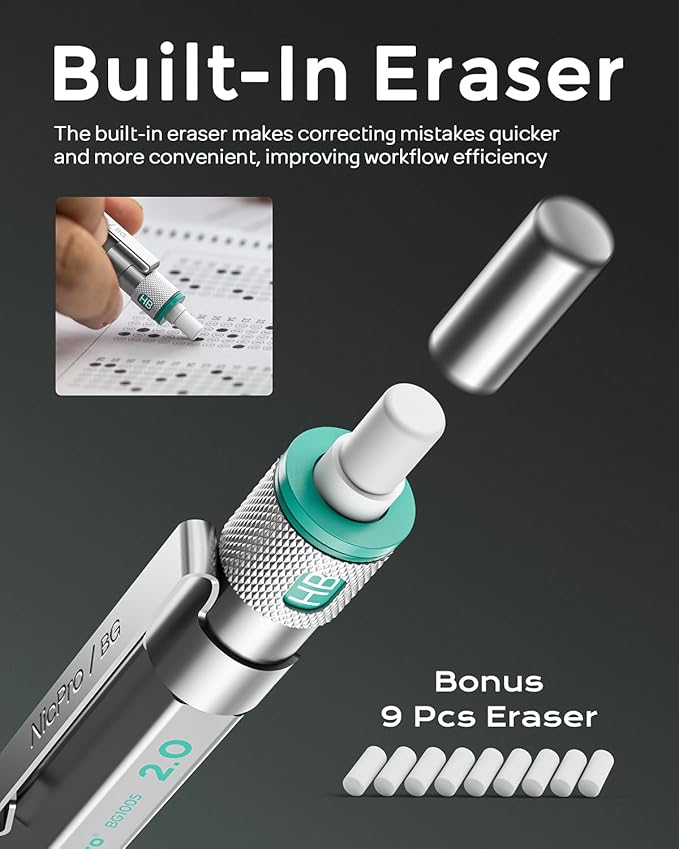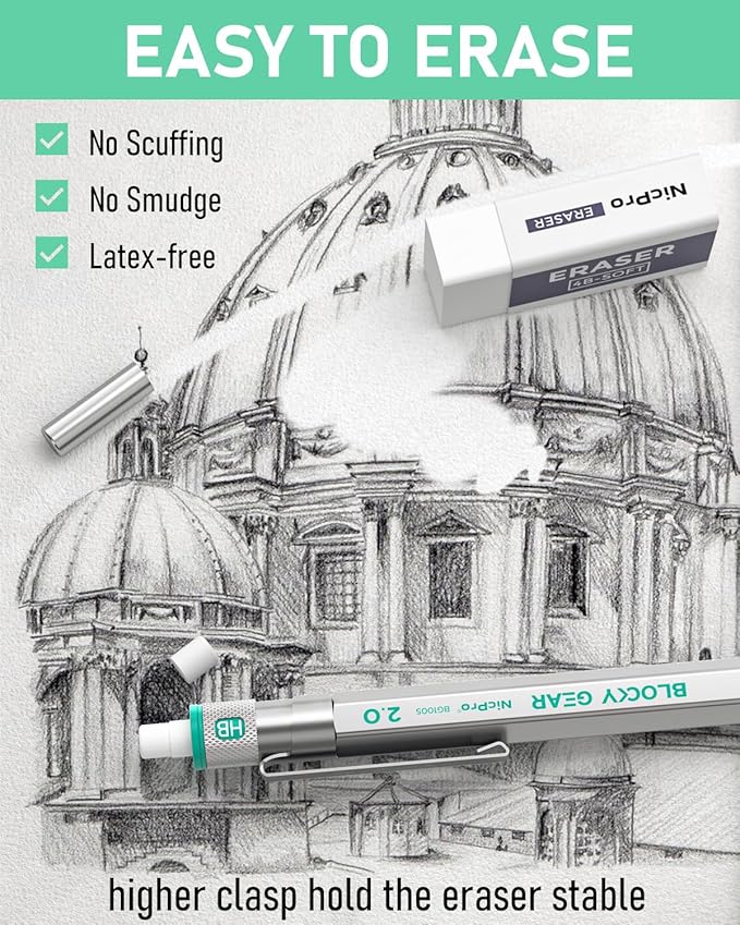 - Nicpro Blocky Gear:Come with a metal 2mm mechanical pencil and 6 tube of 2.0 mm lead refills in different hardness(HB 2B 2H 4B 4H & Colors),1pcs 4B latex-free eraser,9pcs replaceable cap erasers,all the stuff storage neatly in a case with flocking tray,what a gift for friends & family!