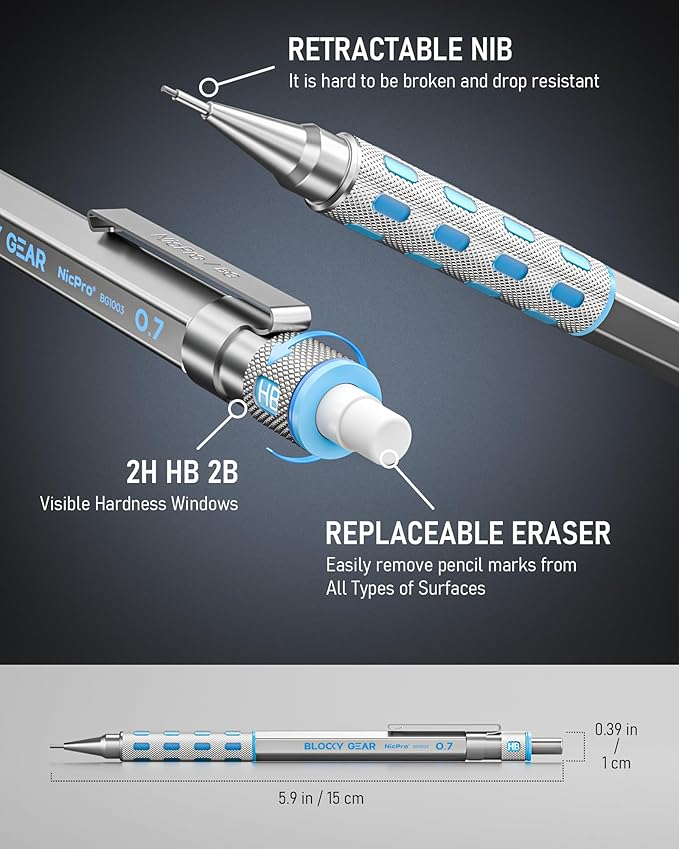 - All-in-One Mechanical Pencil Set:The Nicpro blocky gear set comes with 3PCS metal 0.7mm mechanical pencil and 8 tube of 0.7 mm lead refills (6 tube of HB and 2 tube of 2B), 60pcs / tube, 3pcs 4B latex-free eraser, 18pcs replaceable cap erasers,1 pcs kneaded eraser, all the stuff storage neatly in a case with flocking tray — making it a perfect gift and must-have for students, teachers, artists, and stationery enthusiasts.