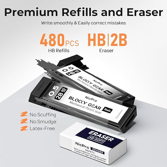 - Nicpro Blocky Gear:Come with 3PCS metal 0.5mm mechanical pencil and 8 tube of 0.5 mm lead refills (6 tube of HB and 2 tube of 2B), 60pcs / tube, 3pcs 4B latex-free eraser, 18pcs replaceable cap erasers,1 pcs kneaded eraser, all the stuff storage neatly in a case with flocking tray,what a gift for friends & family!Ideals for artists, professionals, teachers and students alike