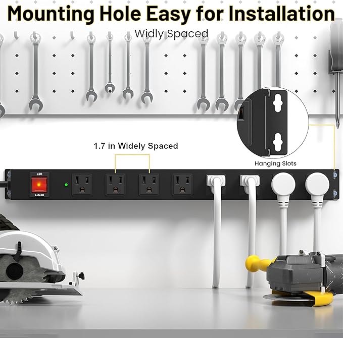 - Wall Mount Metal Power Strip: Mounted it on the wall or under-desk mounting on standing desks, making it perfect for your garage, office, or industrial setup. Whether it's at home, in an office, or in an industrial environment, this power strip is designed to meet your diverse power needs, catering to different settings effectively.