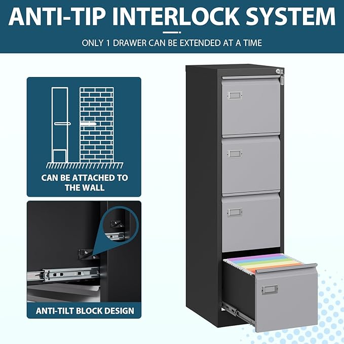 - 【File Cabinets with Lock】The top lock can secure all four drawers and protect your important paperwork, documents and books safe. To improve safe, this interlock system is also equipped with anti-tip mechanism, which is installed on each drawer side.