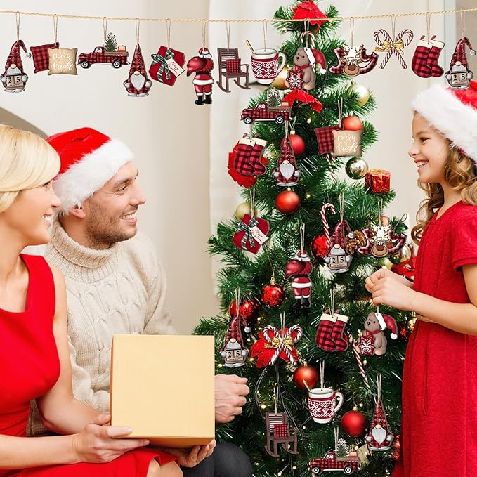 Huwena 36 Pcs Christmas Wooden Ornaments Red Black Christmas Decorations for Tree Snowman Gnomes Poinsettia Flowers Truck Wreath Wood Cutouts Tags with Ropes Winter Decor for Xmas Tree Gifts