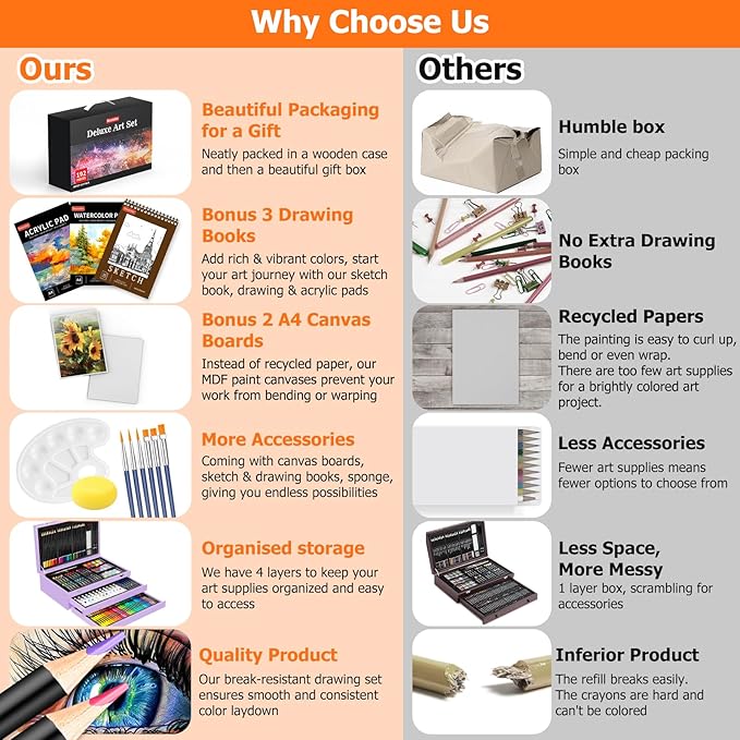 - 【Well Organized Deluxe Wooden Case】Our art kits with removable double drawers are neatly organized in a sturdy wooden case, providing convenient storage and easy access to your art stuff while keeping all drawing supplies tidy. Double wooden box makes it convenient for you to use on the go. Whether you're at home, in the office, at school, or travelling, your art supply kit is always within reach, making your artwork effortless. Great Christmas Gifts Stocking Stuffers Art Sets for Adults Kids.