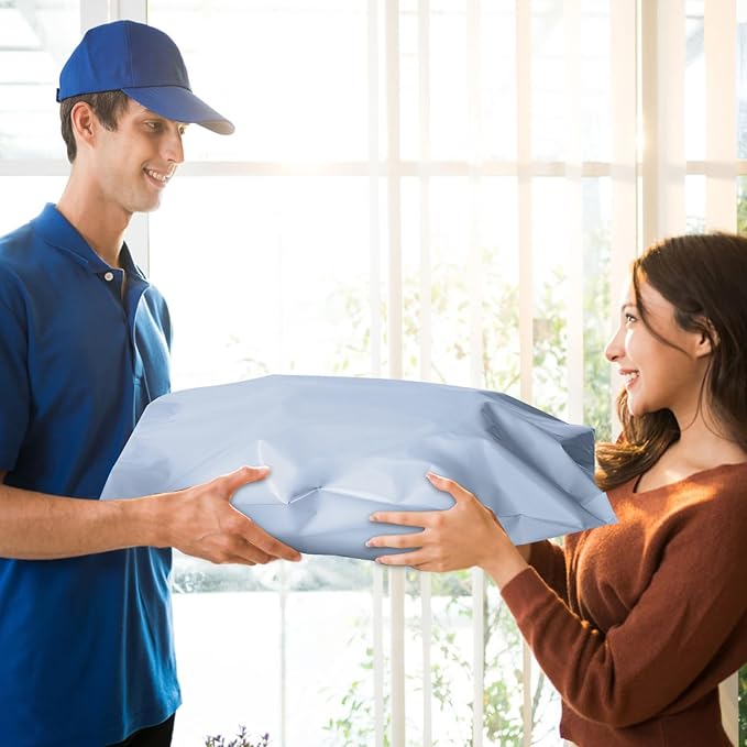 - Eye-Catch Poly Mailers Bags--- Usable size: 19x24 Inch, 100Pack. These shipping bags have a light blue outer surface, and gray inner lining, a highly attractive color that makes your products look better. Their smooth texture makes it easy to affix self-adhesive stamps and address labels, helping you customize your brand.