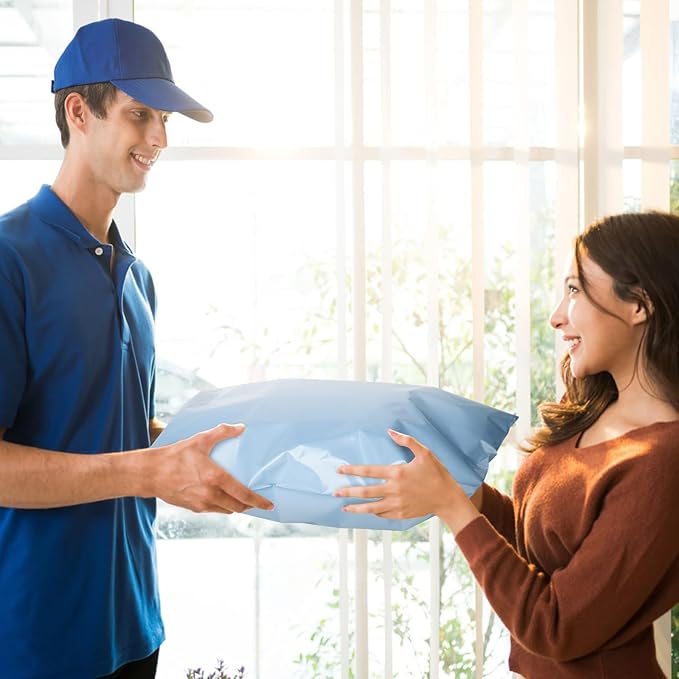- Eye-Catch Poly Mailers Bags--- Usable size: 24x24 Inch, 50Pack. These large shipping bags have a light blue outer surface, and gray inner lining, a highly attractive color that makes your products look better. Their smooth texture makes it easy to affix self-adhesive stamps and address labels, helping you customize your brand.