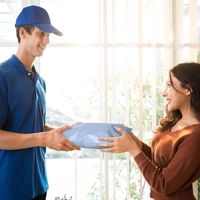 - Eye-Catch Poly Mailers Bags--- Usable size: 6 x 9 Inch, 120Pack. These shipping bags have a light blue outer surface, and gray inner lining, a highly attractive color that makes your products look better. Their smooth texture makes it easy to affix self-adhesive stamps and address labels, helping you customize your brand.