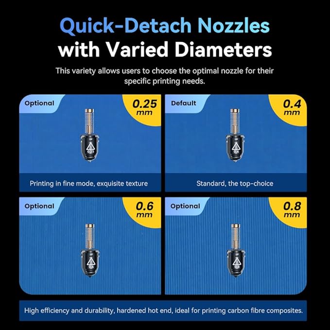 - Patent Quick-Detachable Nozzle: Different nozzle diameter options (0.25/0.4/0.6/0.8 mm) are suitable for both high precision and high-efficiency modes. Quick change nozzle requires no tools and can be changed in as little as 3 seconds. Easy to maintain nozzle for both the novice and the expert.