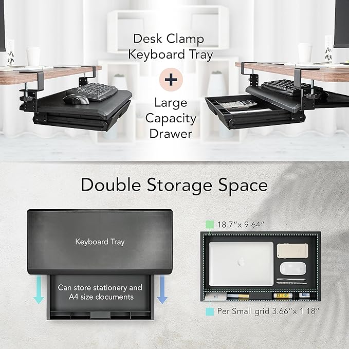 - 【LARGE PLATFORM SIZE】With a platform size of ABS Plastic L27.56 x W12.2 inches and a drawer size of L20 x W12.2 x H2.16 inches, the tray provides ample space for your keyboard and mouse, as well as other office supplies