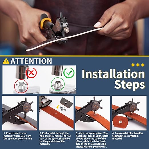 - Excellent Performance - XOOL eyelet tool kit is designed to make punching holes and adding eyelets easy and efficient. It is a perfect tool for any enthusiast! With its precision cutting blades, ergonomic handle, large punch plate, and safety locking hangle, this tool delivers accurate cuts and beautiful eyelets every time, even when working with long hours.