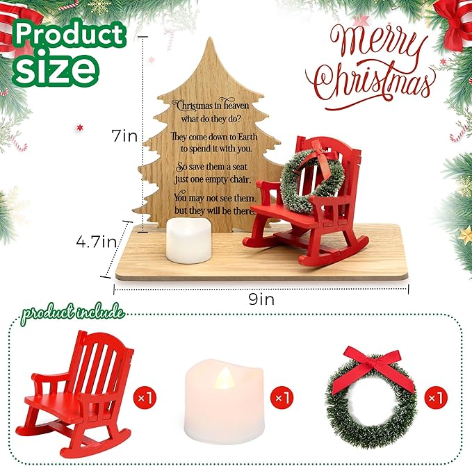- 【Christmas in Heaven Specification】These memorial package include : memory rocking chair(2.6*3.14*4.3in), Christmas tree(7inch), 2 garland rings (2.36in), tealight (1.45*1.37inch), wood candle holders(9*4.7*1.97in)