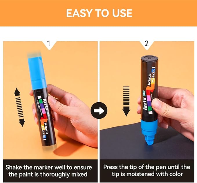 - [Shake Well Before Use] Arrtx acrylic paint pens only require you to shake them and then press down the nib on some paper or card until you see the paint come down