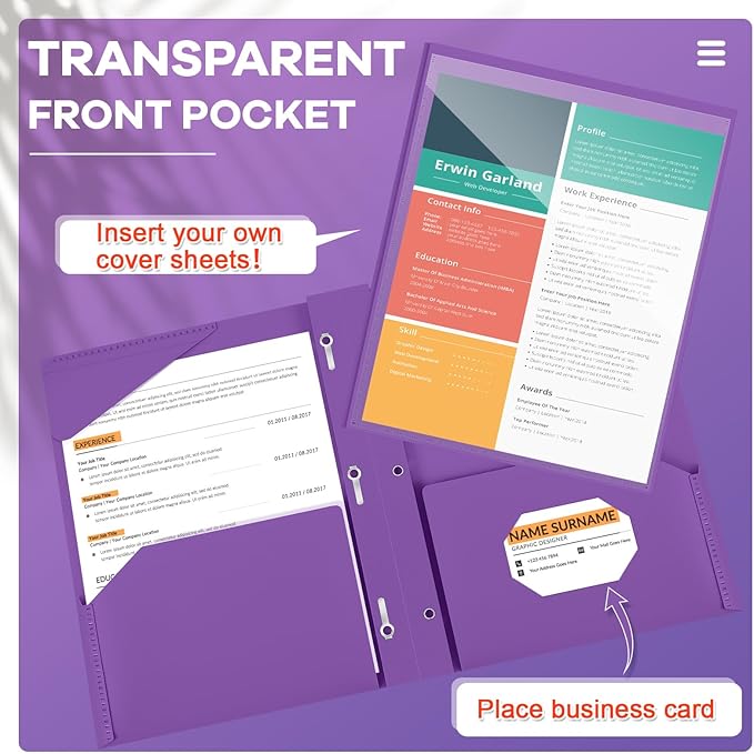 - Practical for You: with a clear front pocket, you can put your catalog, tables, favorite reports, presentations and more for clear display; Each plastic folder has 2 internal pockets to help organize and store your letter sized paper and documents; There are also 3 prongs to secure your 3 hole loose leaf paper in case it falls, and the card slot can hold your ID card or business card, practical for your daily work
